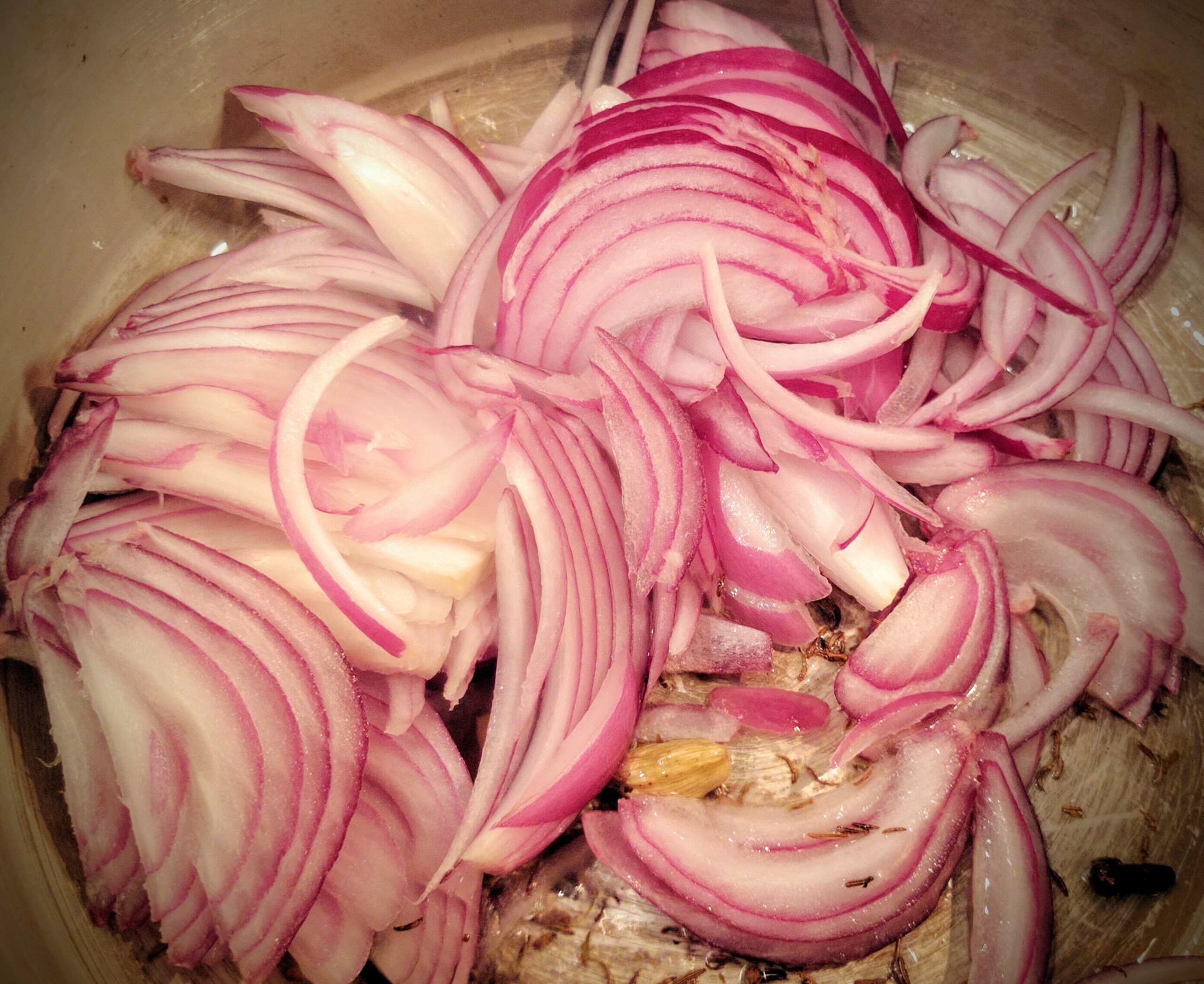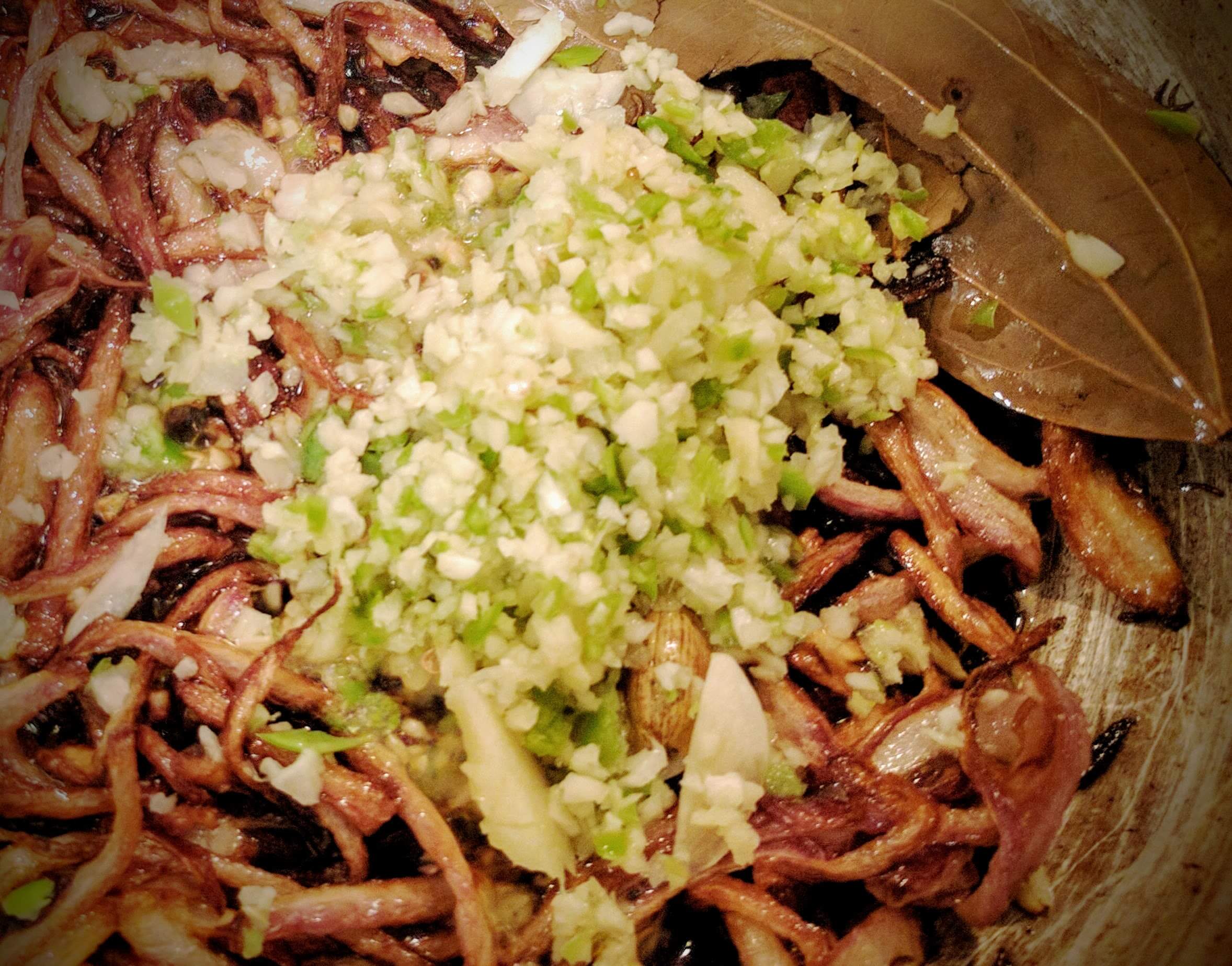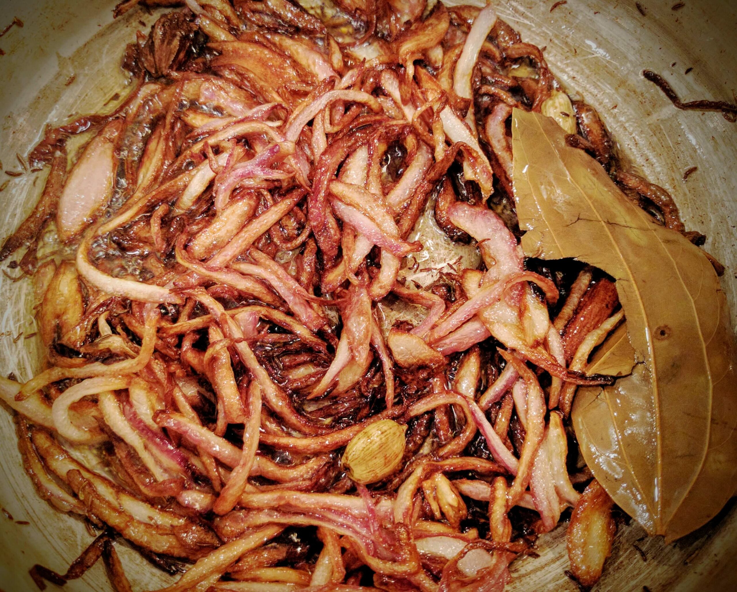 - Then add the thinly sliced onions and fry them till they are golden brown and crispy.