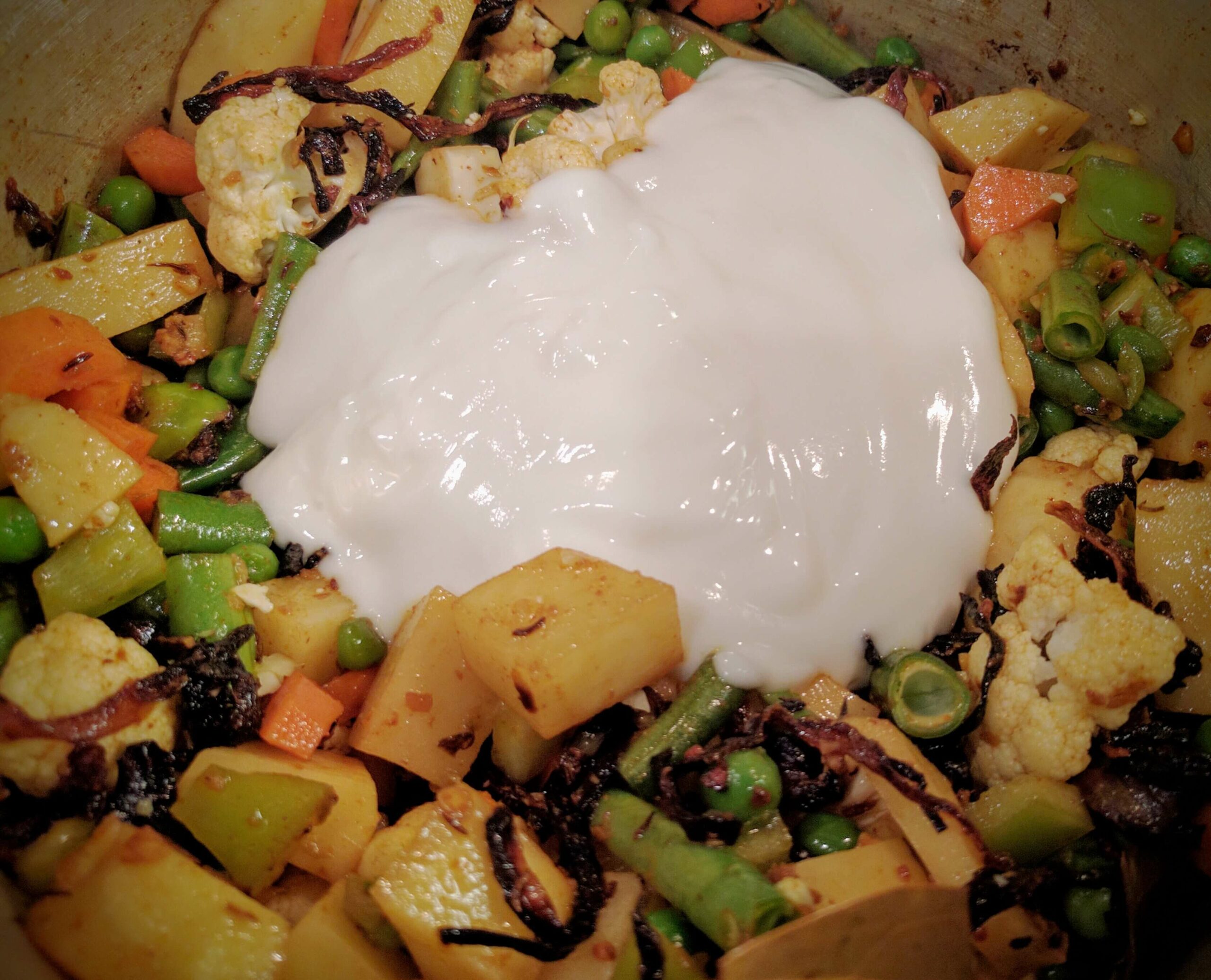 - Add 1 cup of beaten curd to the vegetables along with 1 cup of water. Cover the pan and cook the vegetables for around 5 minutes.
