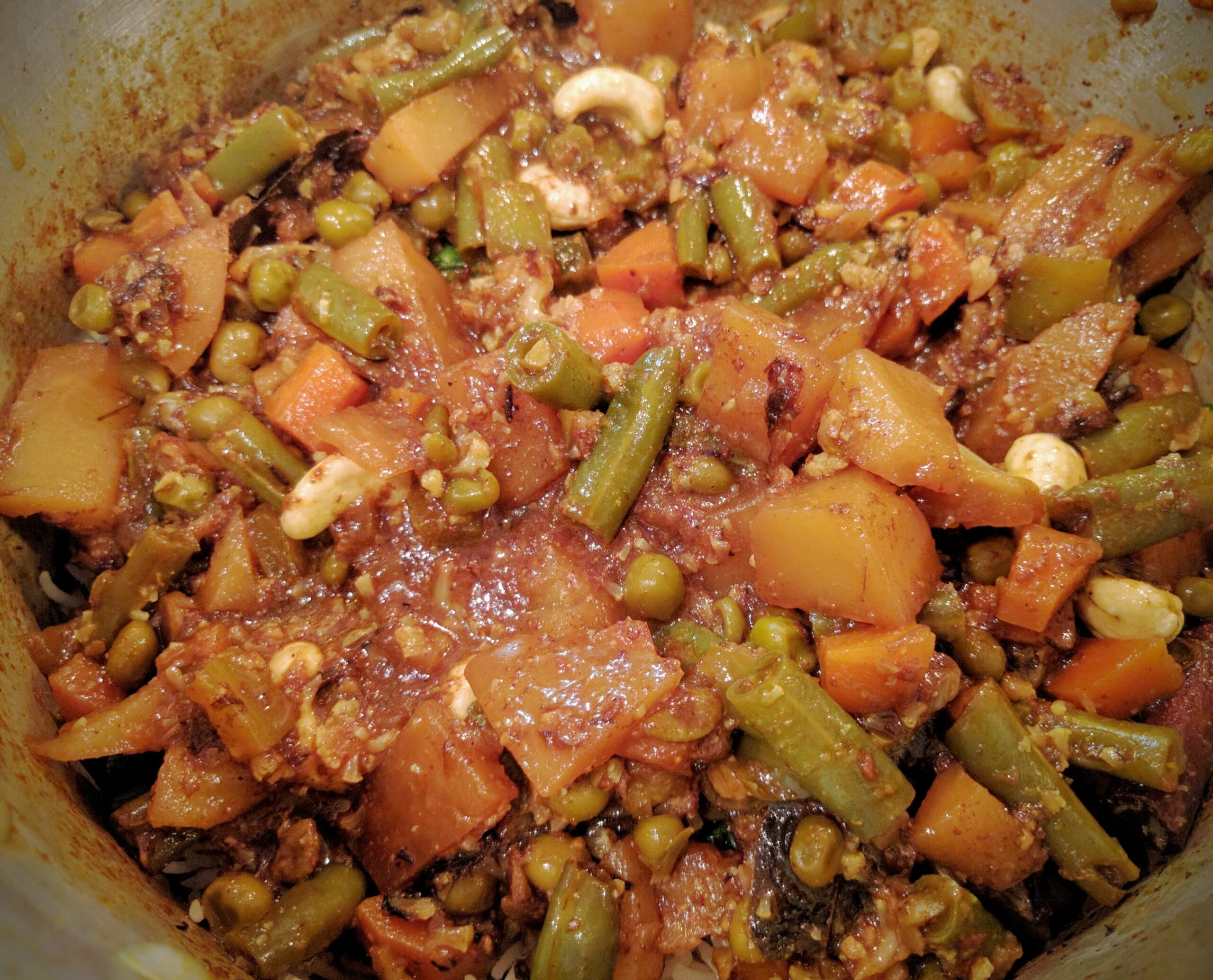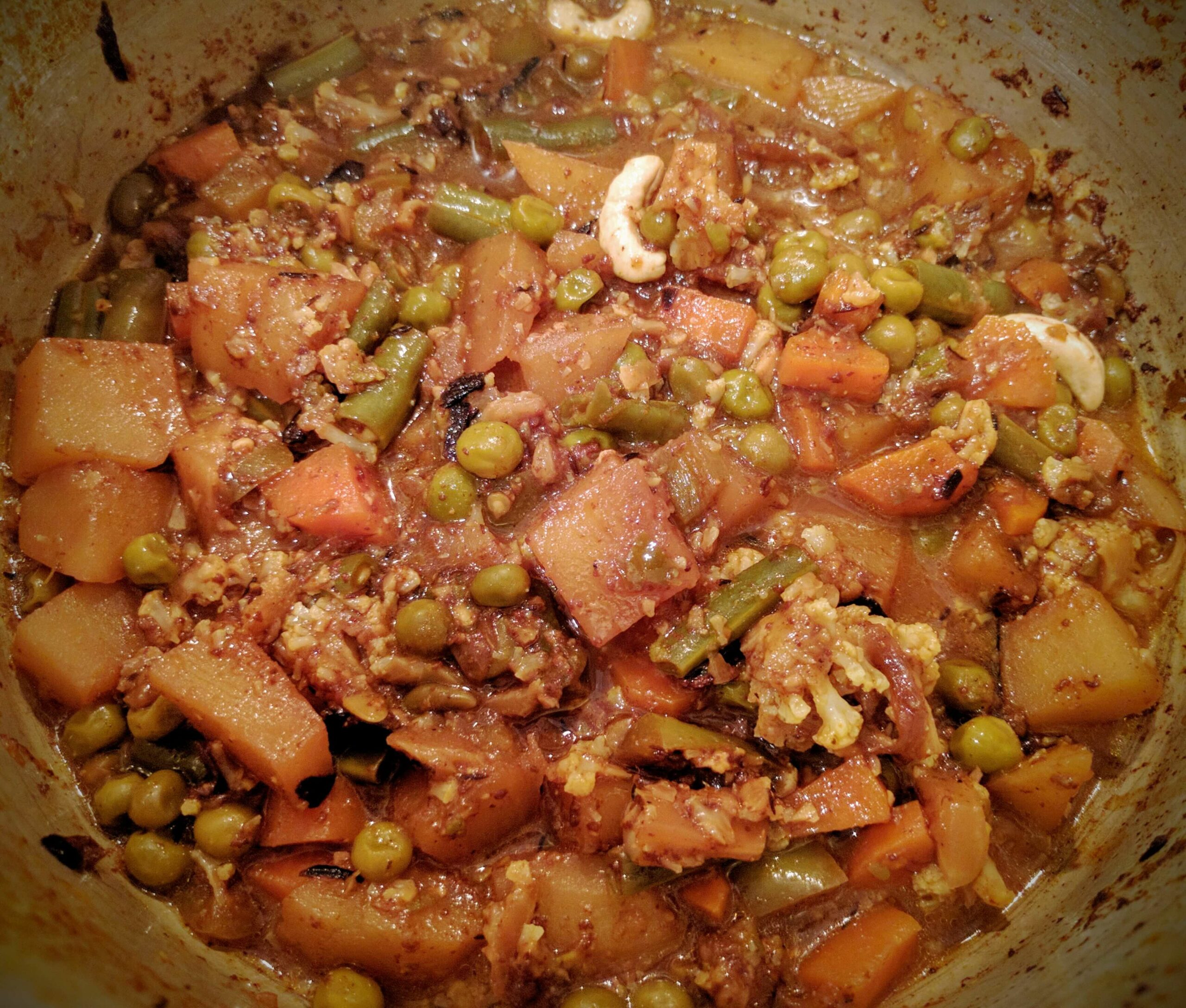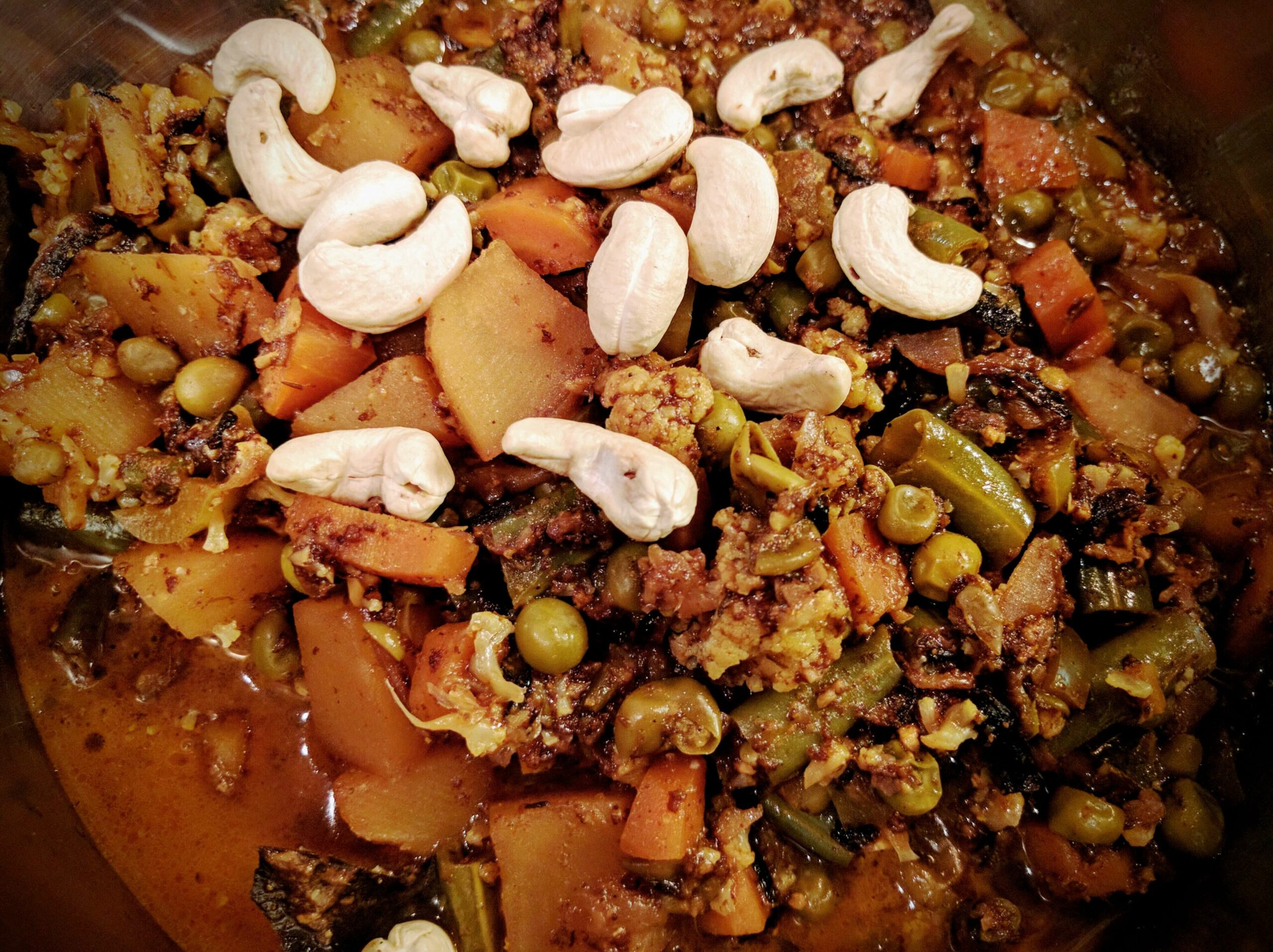 - When the vegetables are cooked add cashews or any dry fruits of your choice to the gravy. Mix well and set the cooked vegetables aside.