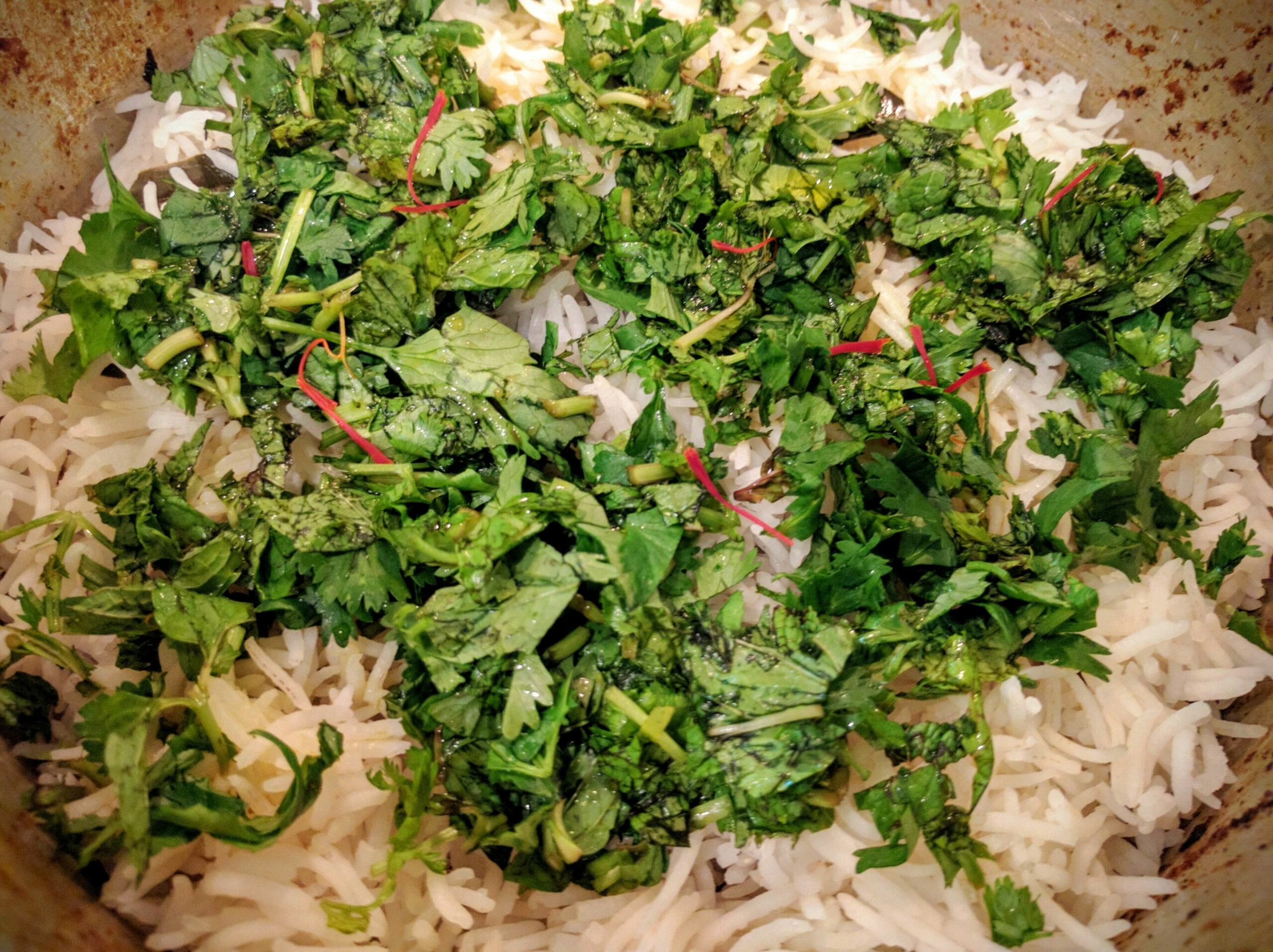 - To prepare for assembling the biryani, chop the mint leaves and coriander leaves. Add 7-8 Saffron Strands to warm milk or water and let them sit for 2-3 minutes.
