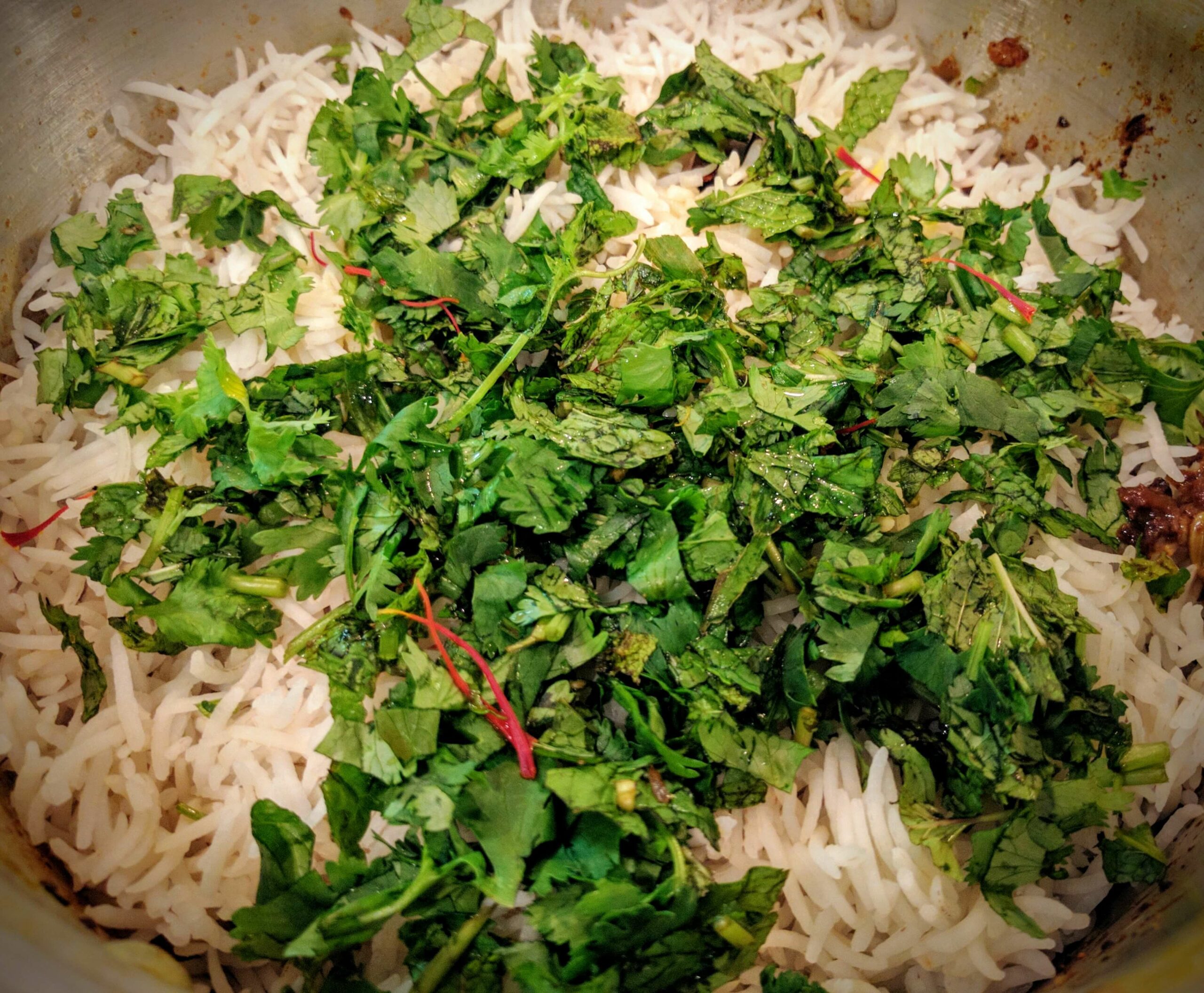 - Divide the gravy and rice into 2 parts. Add the first layer of Vegetables at the bottom of a pressure cooker or a deep pan. Then add a layer of rice. Add half of the mint & coriander leaves and half of Saffron strands soaked in milk. Optionally sprinkle 1 teaspoon Rose Water and 1/2 teaspoon of Biryani Masala on top.Make the second layer of vegetables and rice. Finish with the remaining mint & coriander leaves and Saffron. I have made 2 layers but you can make anywhere between 1-3 layers depending on the width of your pot and the quantity of vegetables and rice.