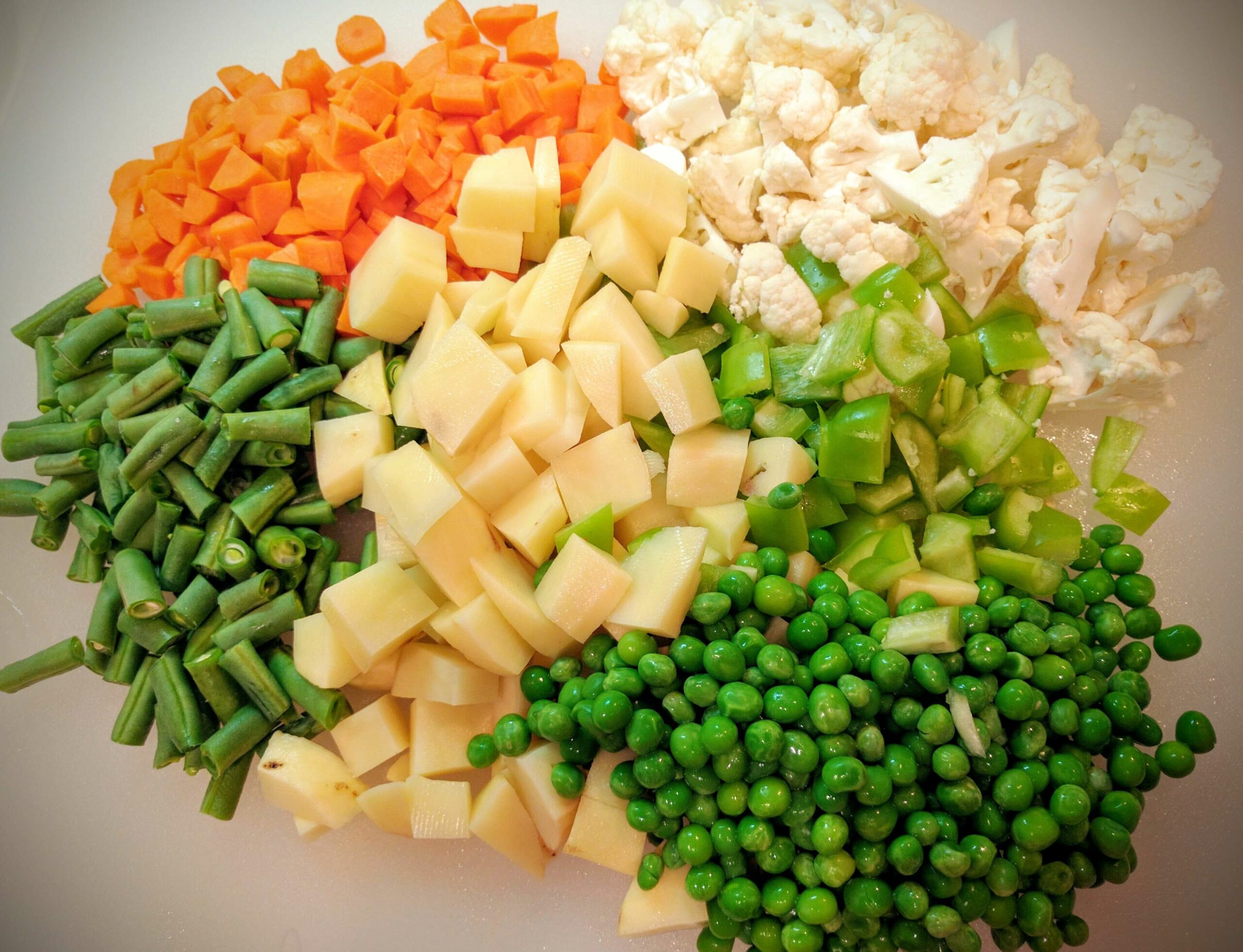 - While the rice are cooking prepare the vegetables. Thinly slice the onions. Boil the peas (I have used frozen ones). Chop the potatoes, bell peppers, cauliflower, carrots and beans into medium sized pieces. Make a paste of ginger, garlic and green chillies.