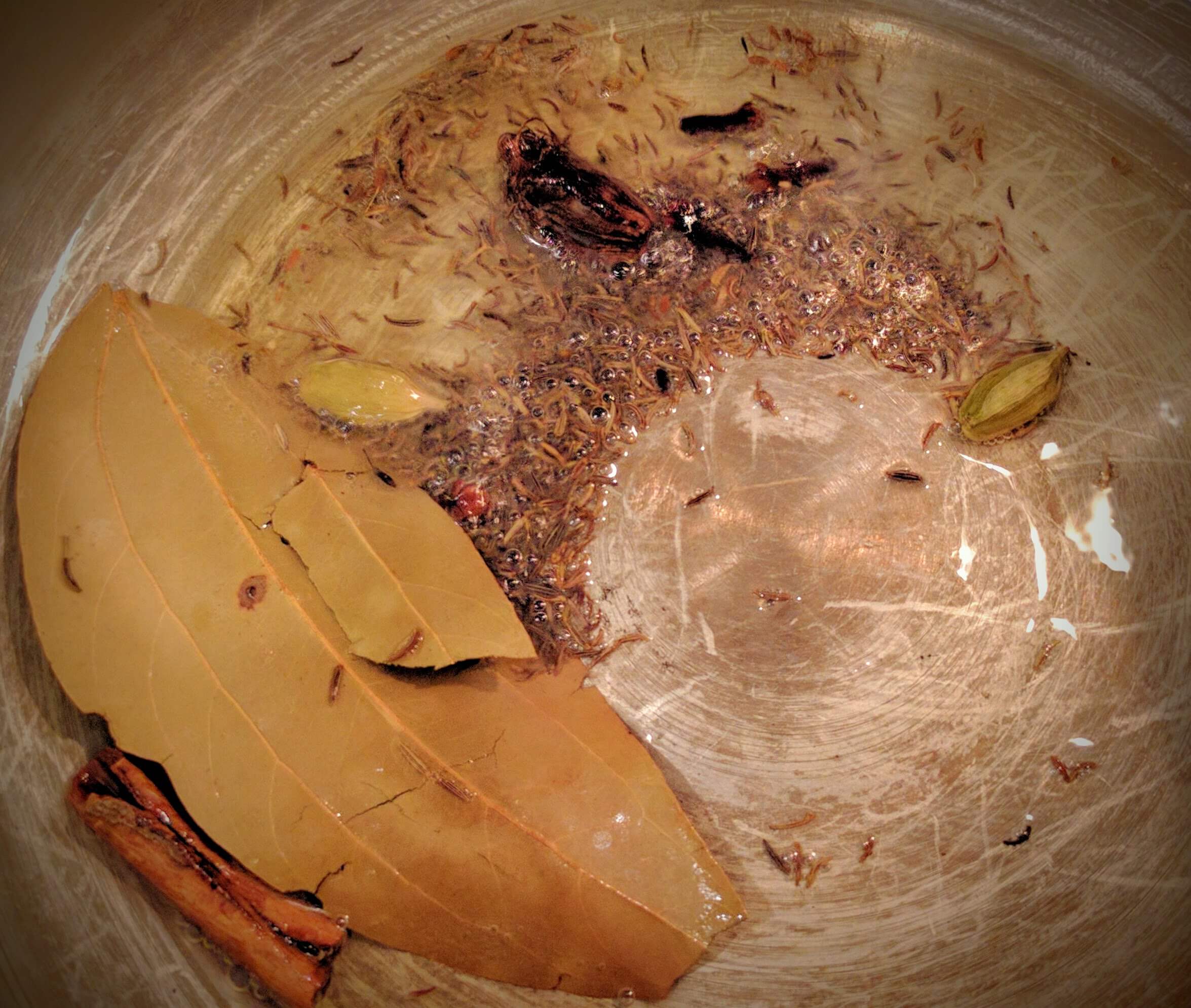 - Heat ghee / oil in a pan or a pressure cooker. Add Shah Jeera, Bay Leaf, Green Cardamom, Black Cardamom, Cloves and Cinnamon.